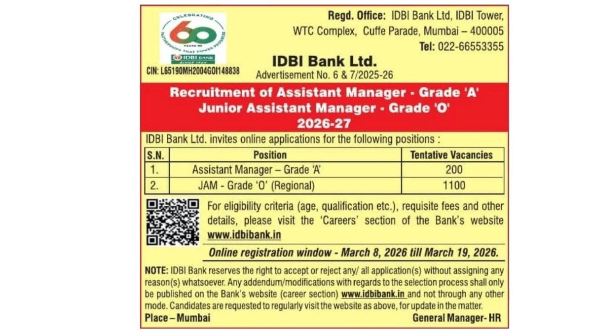 IDBI JAM ભરતી માટે અરજી કરતા પહેલા ઉમેદવારોએ વયમર્યાદા ચકાસી લેવી જોઈએ. જુનિયર આસિસ્ટન્ટ મેનેજર પદ માટે લઘુત્તમ વય 20 વર્ષ અને મહત્તમ વય 25 વર્ષ છે. આસિસ્ટન્ટ મેનેજર પદ માટે લઘુત્તમ વય 21 વર્ષ અને મહત્તમ વય 30 વર્ષ છે. વયની ગણતરી 1 માર્ચ 2026 ના રોજ કરવામાં આવશે.