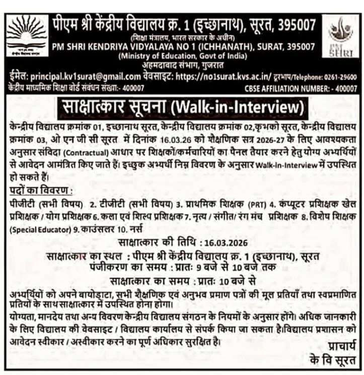 | વોક-ઇન ઇન્ટરવ્યુ | સીધા ઇન્ટરવ્યુમાં ભાગ લો | તારીખ: 16 માર્ચ 2026, નોંધણી: 9:00 AM-10:00 AM, સ્થળ: KV 1 ઇચ્છાનાથ, સુરત |